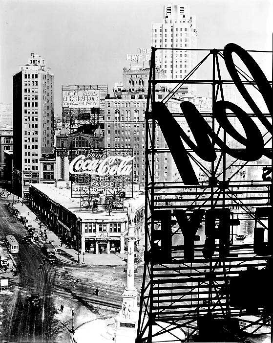 Vintage Columbus Circle, Hearst's skyscraper building with Coke sign, torn down for the Gulf and Western Building, now re-imagined by Phillip Johnson as the Trump International Hotel